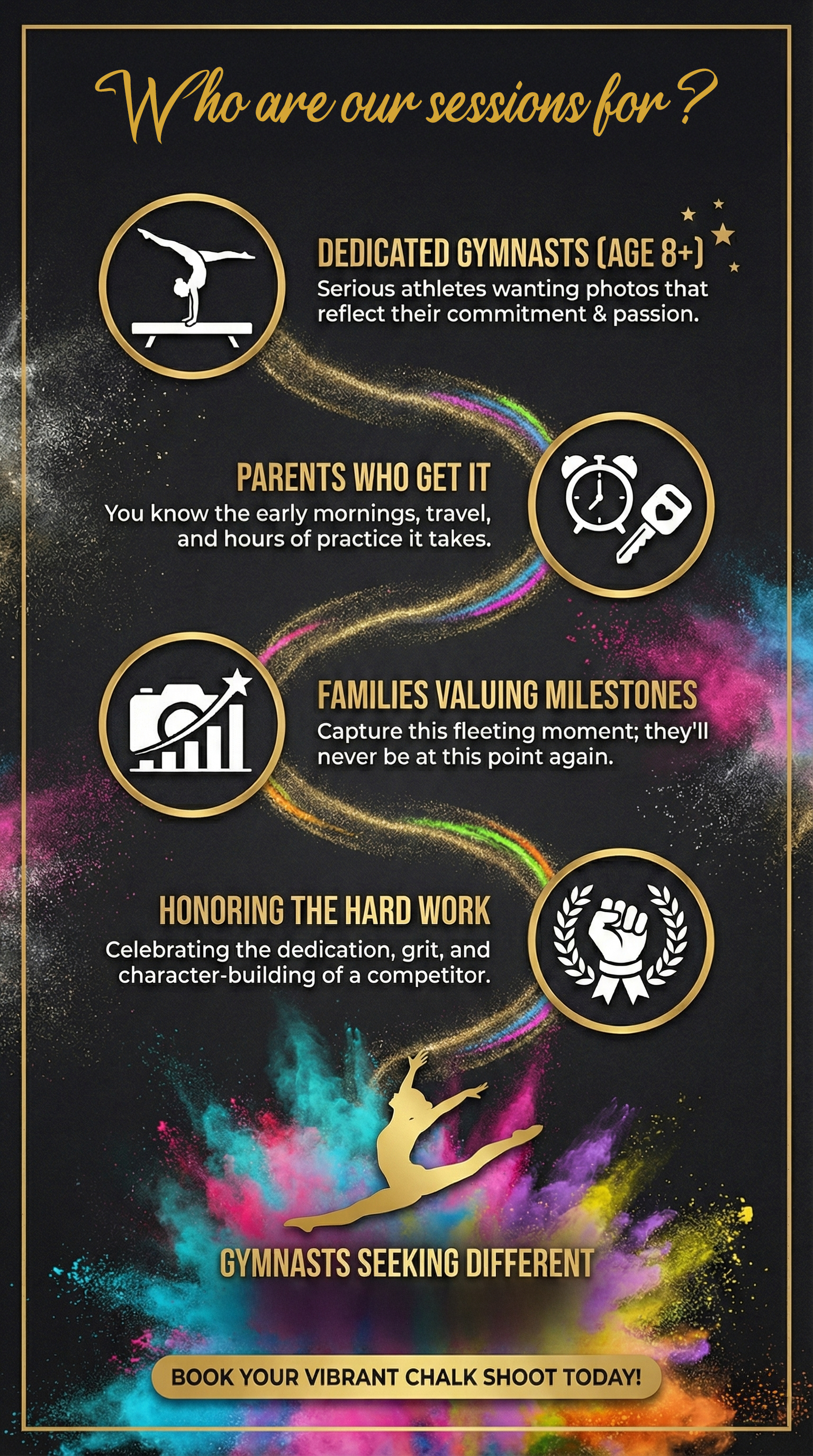 If you're ready for some eye-popping shots of your gymnast captured in dramatic chalk action - check availability before it's too late.